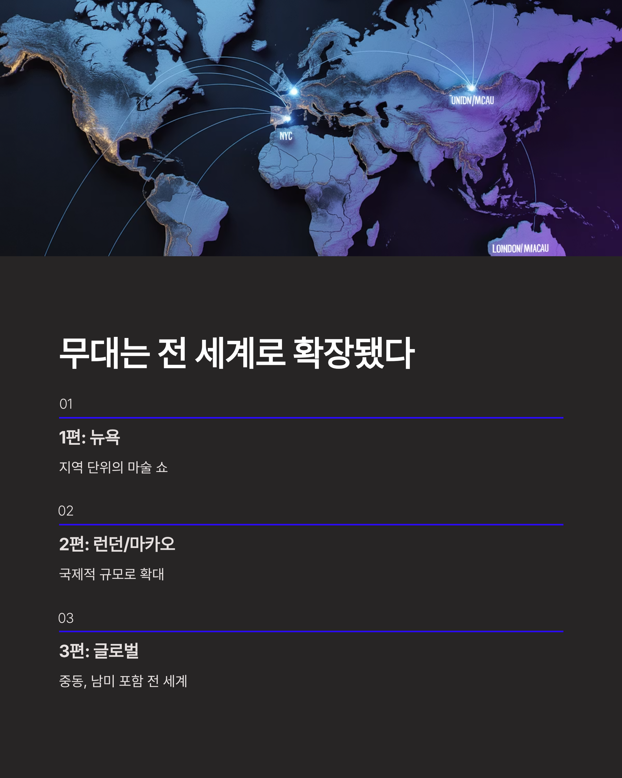 가장 눈에 띄는 변화는 마술의 무대 스케일입니다. * **1편 (나우 유 씨 미):** 뉴욕, 라스베이거스, 파리 등 도시 단위의 금융 시스템을 교란했습니다. * **2편 (나우 유 씨 미 2):** 마카오, 런던 등 대륙 단위로 무대를 넓혔고, 기상 조작 트릭으로 규모를 키웠습니다. * **3편 (나우 유 씨 미 3):** '아이(The Eye)' 조직의 사명을 걸고, 중동, 남미 등 새로운 지역을 포함한 글로벌 규모의 트릭을 선보입니다. 목표는 돈이 아닌, 전 세계 사람들의 인식을 영원히 바꾸는 것입니다.