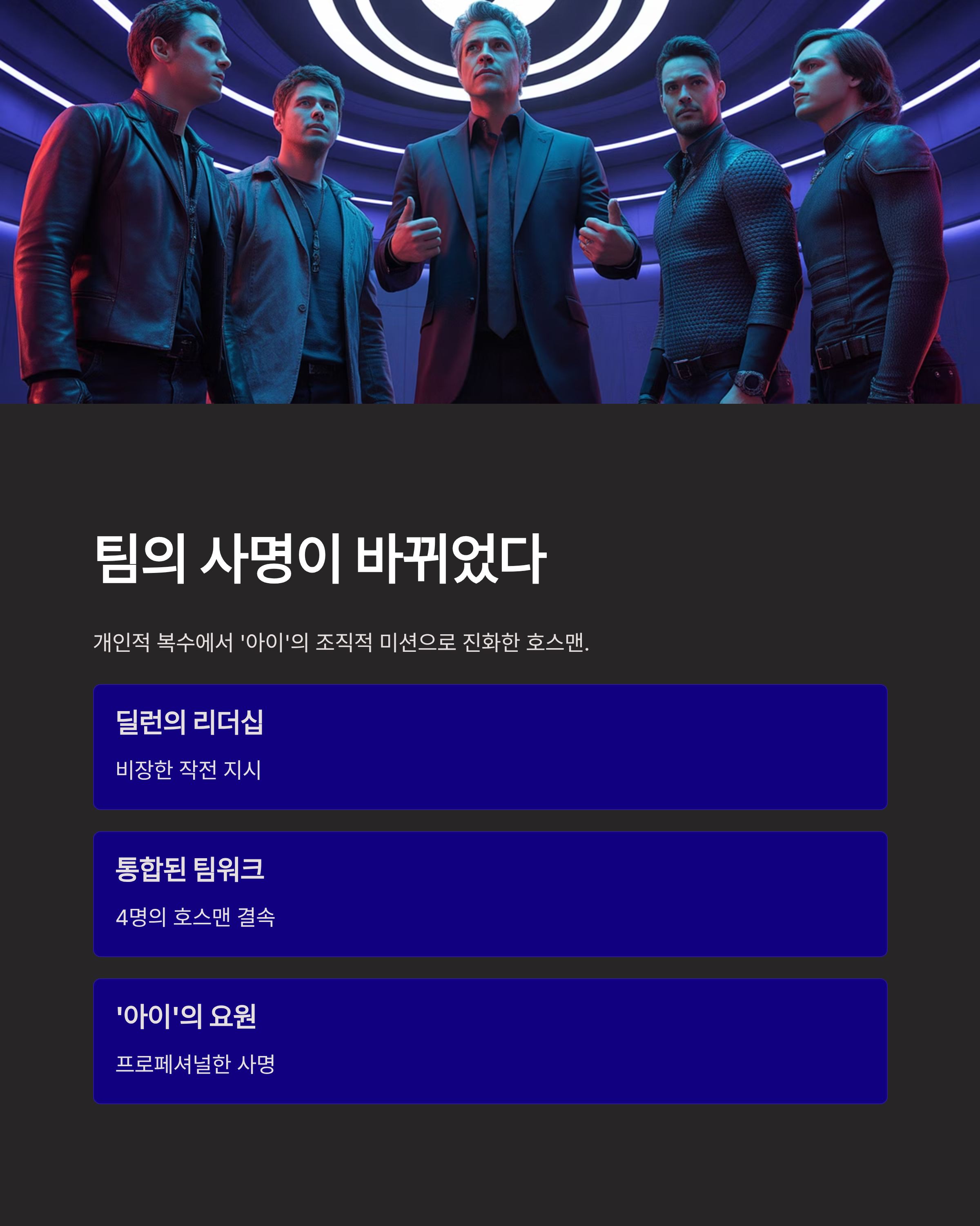 하지만 **나우 유 씨 미 3**의 호스맨들은 '아이'의 정식 일원으로서 움직입니다. 따라서 목표는 더 이상 돈이나 개인의 복수가 아닌, '아이' 조직이 수천 년간 추구해 온 마법을 통한 궁극적인 정의를 실현하는 것입니다.